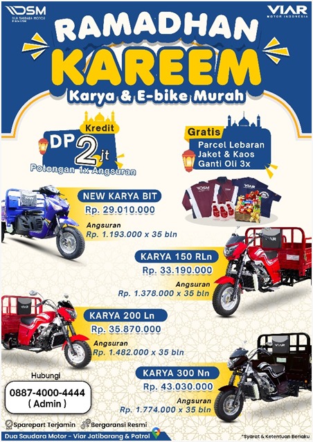 Bulan suci Ramadhan telah tiba! Saat yang tepat untuk berbagi kebahagiaan dan menikmati promo spesial dari Dua Saudara Motor – Viar Jatibarang & Patrol. Kami menghadirkan PROMO RAMADHAN KAREEM untuk motor roda tiga viar dengan DP mulai dari 2 jutaan! Dan dapatkan juga diskon khusus pembelian cash hingga 1 juta rupiah! Khusus kamu yang tinggal di Indramayu, Cirebon, Majalengka, Subang dan sekitarnya.